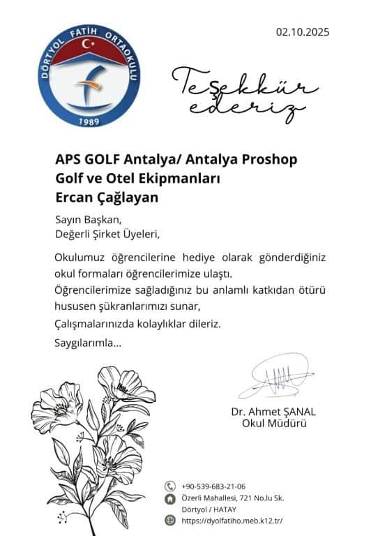 Okulumuzda öğrenim gören forması olmayan öğrencilerimize hediye olarak APS GOLF Antalya/ Antalya Proshop Golf ve Otel Ekipmanları şirketi kurucu başkanı Ercan Çağlayan tarafından gönderilen okul formaları öğrencilerimize ulaştı. Okul Müdürü Dr. Ahmet ŞANAL, bu anlamlı davranışlarından ötürü ilgili kuruluşa ve bu hayra vesile olan okulumuz İngilizce öğretmeni Emine Gürbüzerol'a teşekkkür etti.